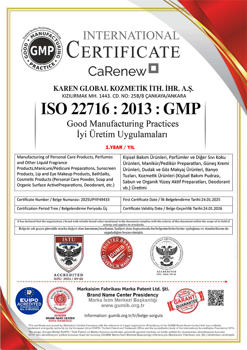 Karen Global Kozmetik A.Ş., kozmetik endüstrisinde en yüksek kalite ve güvenlik standartlarına uygun olarak faaliyet göstermekten gurur duyar. Mükemmelliğe olan bağlılığımız, aşağıdaki sertifikalarla yansıtılmaktadır:
